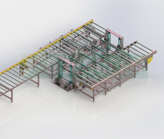 使用機(jī)械推手將板材推入碼垛堆疊,堆疊成包裝要求高度,輸出打包。